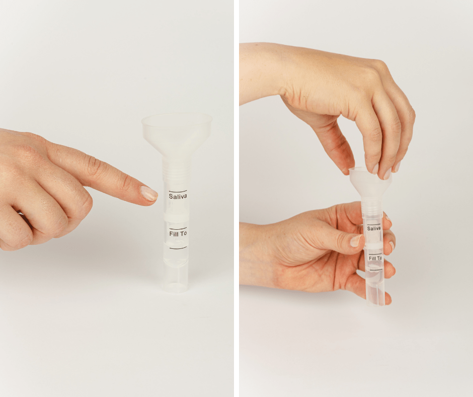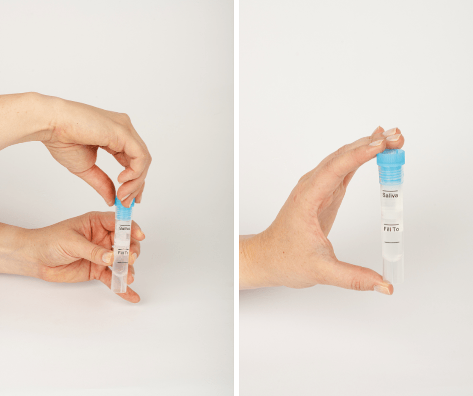 Step 15: Fill the tube with saliva until it reaches the “Saliva” line - not including bubbles.