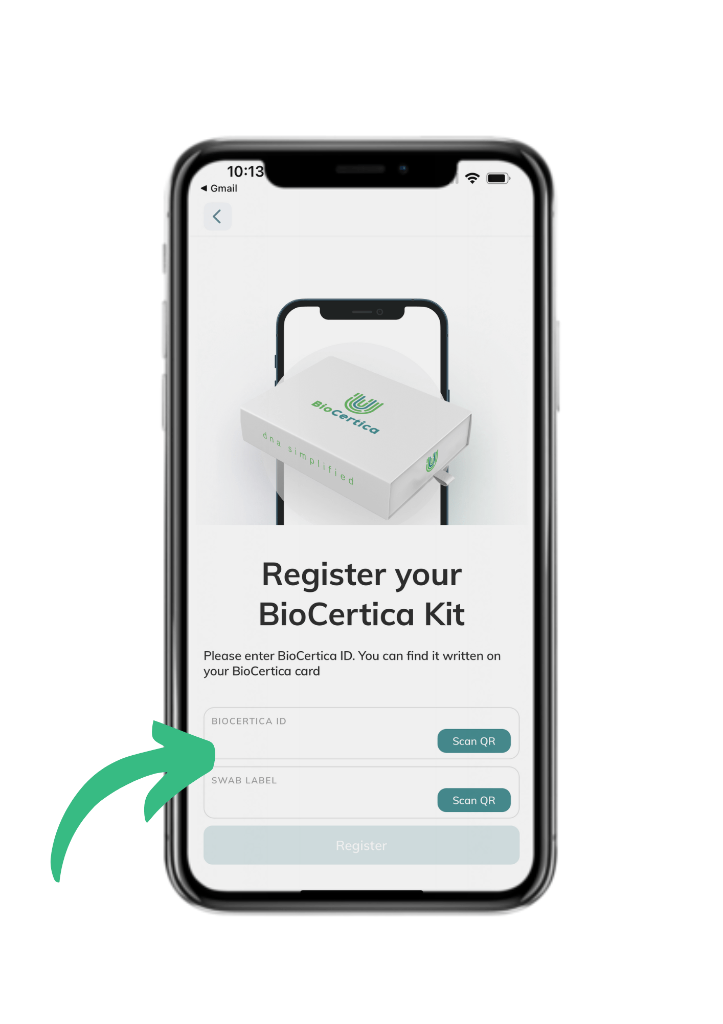 Step 9: Enter your BioCertica Kit info: BioCertica ID (number on the card) and you can scan the barcode code on the BioCertica card. For Swab Label (this is the BCRT number)and you can scan the swab label barcode (a sticker on the side of the plastic sample box).