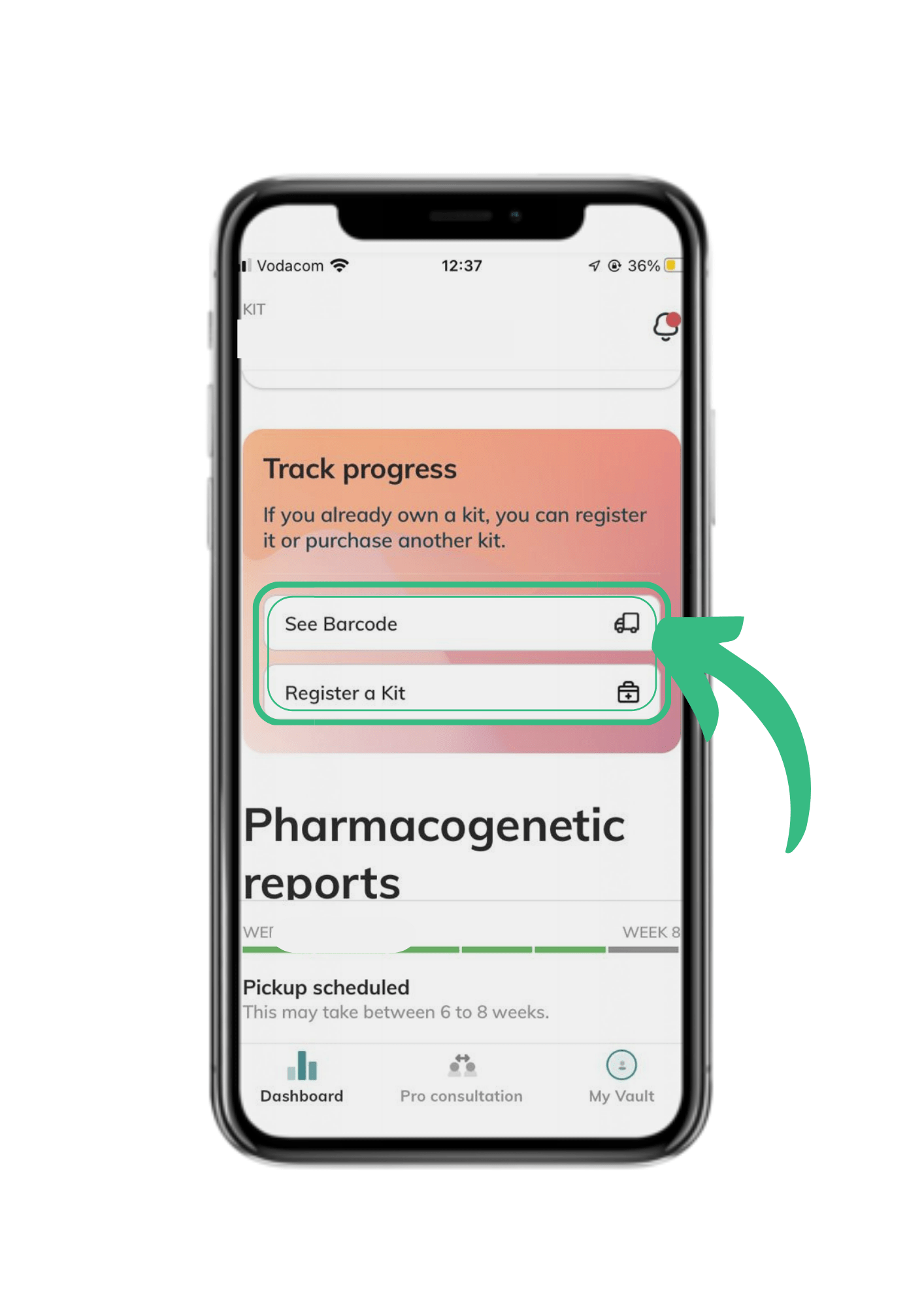Step 20: Once Aramex collects your sample, they will ask for a bar code. Select the See Barcode button under your Track progress section on the home screen.